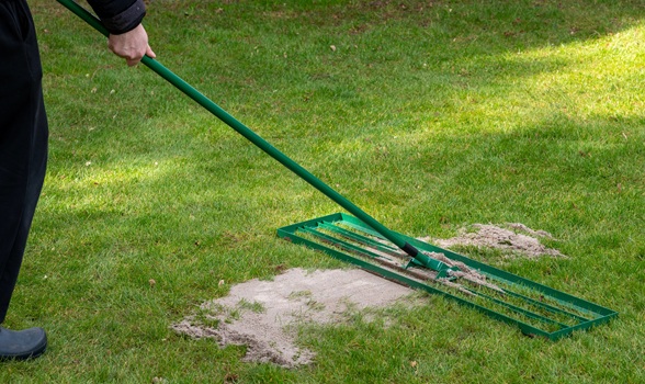Core aeration opens compacted ground, which improves seed to soil contact and deepens root pathways. Then overseed evenly across thin areas, and lightly rake to settle seed into the top quarter inch, so contact and coverage stay consistent.